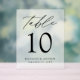 Trendy, minimalist wedding table number cards featuring "Table" displayed in a black calligraphy script with a faux frosted acrylic background. To order the acrylic table card sign: add your name, wedding date, and table number. Add each number to your cart individually and checkout when you're finished.