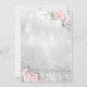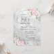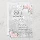 A modern, chic and glamourous invitation with pink flowers on a silver bokeh background.