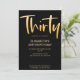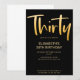 Introduce new modern, elegant 30th birthday party invitation, black background with gold handwritten typography text "thirty". Customise this template card by adding your own party information.