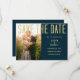 Unique wedding photo Save The Date. Deep blue (ocean blue) background. Gold lettering (gold is not real gold but colour). Modern streamlined font. Truly unique, simple, and elegant. For fall wedding, summer wedding, garden wedding, or any kind of modern elegant wedding.