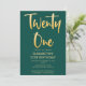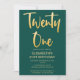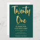Introduce new modern, elegant 21ST birthday party invitation simple emerald green background with gold handwritten typography text "twenty one". Customise this template card by adding your own party information.