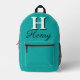 A personalised monogram backpack designed in a modern elegant style. This elegant Spring Teal backpack features a bold white initial 'H' with a black shadow and a customisable name in black script font. Perfect for adding a touch of sophistication and personalisation to your everyday style. Ideal for school, work, or casual outings, this backpack combines functionality with a chic design that stands out.