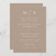 Set the tone for your special day with this minimalist modern wedding invitation, showcasing your monogram initials and wedding details in elegant white lettering. Graceful calligraphy script accents add a romantic and timeless feel. The warm taupe background brings a soft, neutral elegance and can be customized to any color of your choice to complement your wedding palette. Perfect for couples who love understated sophistication with a personal touch. Easily make it yours with customizable details!