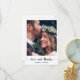 This elegant wedding thank you postcard has a photo in the front with Love and Thanks text overlay and the couple's names.