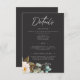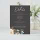 Our charcoal black wedding details enclosure card with a striking white peony, soft yellow centre, lush greenery, and delicate cotton bolls is a modern masterpiece. Add your favourite photo to set the stage for your announcement. The crisp white text adds a touch of elegance, while the dark background creates a dramatic backdrop for your special day. Add your favourite photo This design is a breathtaking blend of modern elegance and timeless romance. Created by Simply Farmhouse Press.