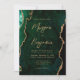 This elegant wedding invitation features a background image of emerald green watercolor agate trimmed with faux gold glitter. The customisable text combines gold-coloured modern handwriting, copperplate and italic fonts. The reverse side provides space for wedding details on a matching green agate background, along with a QR code guests can scan to visit your website and RSVP, which saves the cost of printing and mailing separate RSVP cards.