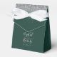 The front flap of this elegant modern wedding favour box features a silver faux glitter border. The customisable text combines silver grey handwriting and copperplate fonts over a large ampersand on an emerald green background.