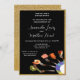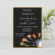 This template invitation features a modern food-on-forks design on black with a gold glitter border. Personalise with your engagement party information. Shown in a 5x7 size larger or smaller sizes are also available.