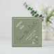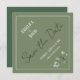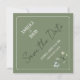 Modern Square Save the Date, clean and minimalistic with eucalyptus, greenery and a green colour palette. Sage on the front and darker olive green on the back. The front has all the text in 45˚ angle to make it more interesting and memorable. A white narrow line as a frame together with a single branch of eucalyptus in the lower corner.