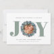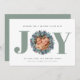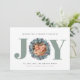 Modern Eucalyptus Photo Typography Christmas Card - JOY is featured in modern bold typography in sage green with a eucalyptus and holly berry wreath surrounding your favourite photo. Editable greeting reads " Wishing you a holiday filled with JOY." All our love, your family name and family members. All text is editable. Background can also be changed to any colour you like.