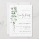 Modern Eucalyptus Script 21st Birthday Party. Minimalist botanical style, with watercolor greenery flowing down on the left hand side and text to the right. A set handwritten script for Twenty First and the rest of the text you can easily personalise.