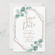 This botanical wedding save the date flat card features a modern design template with the words "Save the Date" in hand lettered faux copper script with your wedding details in the centre for you to personalise bordered by a geometric faux copper frame accented by hand painted watercolor eucalyptus greenery. Best of wishes for your wedding! Designed by Susan Coffey.