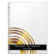 A professional notebook design featuring golden circles over a white background embellished with a thin black band. Personalise with your details. See the matching business card here: