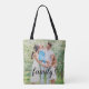 Carry your favorite memories with this beautiful photo tote featuring a full-bleed personal photo overlaid with "Family" in elegant calligraphy script finished with a sweet heart flourish. A meaningful keepsake for everyday use, family reunions, or a thoughtful gift for parents and grandparents. Photo and text are fully customizable.