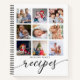Modern, elegant photo collage recipes book features 8 photos of the family, typography script ''recipes'' in trendy lettering and family name.