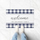 Custom-designed farmhouse style welcome doormat featuring personalised family name on navy blue and white buffalo check pattern.