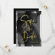 These modern, elegant wedding save the date cards feature your own personal photo covering the background completely. A sheer black overlay contains faux gold trendy script typography, and there is more room for your information on the back of the card. A glam, stylish look your guests will love!