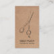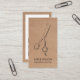 Elegant fully customisable business card template with PRINTED kraft paper background, black scissors icon. Modern elegant design for hair studio, hair stylist.