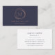 Striking business cards feature an abstract element in faux rose gold, encircling your initials or monogram in modern calligraphy script on a rich midnight blue background. Personalise with two custom text fields beneath for your name and title or business name. Add your full contact details to the reverse side. Suitable for any occupation; example shown for hair and makeup artists. NOTE: THERE IS NO FOIL ON THIS PRODUCT. The rose gold effect is created using subtle colour variations that mimic the look of foil.