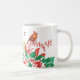 Warm up the Christmas season with this cheerful holiday mug featuring a female cardinal and festive holly in red and green on both front and back with a modern black monogram on a white background. Makes a great personalized gift for her. Designed by © Tim Coffey.