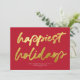 This modern yet festive business holiday card features a large calligraphy script "happiest holidays" in faux gold foil over a red background. The back of the card is also red. The background colours and text colours are customisable. DESIGN TIP: You can further customise this design by adding a photo, logo, and/or additional text to the back.