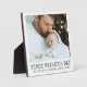 Commemorative Dad's FIRST FATHER'S DAY with this photo easel-back display with an editable title FIRST FATHER'S DAY and a second line of text for your custom message in your choice of font styles and colours (shown in a classic typography in charcoal grey on white). ASSISTANCE: For help with design modification or personalisation, resizing or transferring the design to another product, contact the designer BEFORE ORDERING via Zazzle Chat or makeitaboutyoustore@gmail.com.