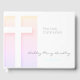 Simple and large white Christian Cross with soft drop shadow on pastel colours (yellow pink mauve) background. Design on hard cover guest book with texts for First Holy Communion to customise. You can easily change text (colour, font, size and position) by clicking the customise button.