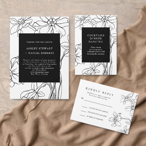 Elegant, modern wedding invitation suite with a timeless floral drawing. Simple and classic, black and white design.