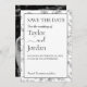 The card features a crisp white center for maximum clarity, framed by a bold black border and a beautiful black and white botanical line art background. The classic "SAVE THE DATE" header is balanced by elegant serif and script typography for the names and event details.