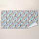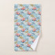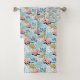 Colourful stylised, pop art flowers with blue, green, and black accents on a sky blue background make a modern and stylish towel set.
