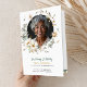 This elegant floral celebration of life program blends timeless design with heartfelt personalization to create a meaningful printed keepsake for memorial services. The front features a circular photo frame surrounded by soft watercolor florals in muted tones of white, blush, green, and gold, with customizable name and date fields beneath the editable phrase “In Loving Memory.” Inside, a clean layout provides organized sections for the order of service, obituary or life overview, and acknowledgments on the back, all beautifully accented with matching floral illustrations along the bottom edge. Designed for clarity and emotional resonance, this funeral program offers space for personalized headings, thoughtful tributes, and messages of gratitude. Perfect for traditional funerals, memorial services, or celebration of life events, this printed program serves as both a service guide and cherished memento for family and guests. Its soft, botanical design and structured layout bring comfort, warmth, and lasting tribute to the memory of a loved one.
