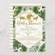 Looking for a modern foliage baby shower invitation? This design is fresh and features a faux gold brush calligraphy heading. The background is a tropical foliage pattern and a hexagon shape with a faux gold border and faux gold safari or jungle animals. This design is suitable for a gender neutral baby shower.