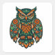 High-quality die-cut sticker featuring a symmetrical owl illustrated in a modern folk art style. The wings showcase intricate floral patterns in a bold emerald green and electric orange palette. Finished with a hand-drawn woodcut texture and clean white border. ideal for laptops, bottles, notebooks, packaging, and t-shirts, creative branding.