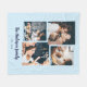 This simple yet ultra modern blanket features four of your favourite personal photos in a unique, layered look photo grid. The light blue design features your family name in navy blue elegant, trendy handwritten script typography, and has a spot for the year established in a coordinating sans serif font.