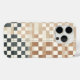 Elevate your tech with this unique four-quadrant geometric phone case. Featuring a sophisticated transition between soft cream, warm tan, and deep slate grey chequered patterns, this design offers a balanced and artistic aesthetic. Perfect for those who love abstract minimalism and architectural colour blocking, providing a sleek and professional look for your device.