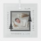 Minimal and elegant, this keepsake baby photo ornament beautifully captures your newborn’s first Christmas. Featuring a classic black and white striped frame, the design highlights your baby's photo with timeless style. Surrounding the image, delicate evergreen trees and modern typography showcase your baby's name, birth date, time, and stats in a clean, contemporary layout. A meaningful and stylish way to commemorate a precious moment during the holiday season. Hand-drawn original illustration by ©Moodthology Papery