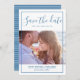 Modern Framed Save the Date Announcement with a simple and classic border design in blue. Thin stripes adorn the back of this announcement. Add a photo and wedding details to customise. Background colour on back side of invite may be changed to complement the photo or to add a wedding colour.