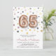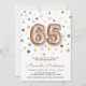Modern fun rose gold 65th balloon birthday party invitation. Design featuring number 65 in rose gold balloon shape, confetti and party details on the front. Solid dark gray color on the back. To edit this template click customize further.