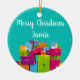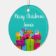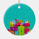 A cute , fun and modern image of wrapped Christmas presents in pink, purple, green and bright modern colours. Against a customisable bright blue background. Fun and colourful Christmas style.