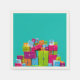 A cute , fun and modern image of wrapped Christmas presents in pink, purple, green and bright modern colours. Against a customisable bright blue background. Fun and colourful Christmas style.