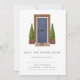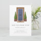 The VESTA funny moving announcement printable card features a simple layout with a watercolor navy blue front door with two green plants and a home sweet home rug, paired with a modern sans serif and classic script font combo highlighting the moving annoucement and the new address.