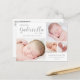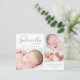 A modern gender neutral birth announcement post card to share the news of your baby's arrival. The white front features a 4 photo collage with baby's name in a modern grey script. All other key details including birthdate, birth stats, parents names are in a simple grey typography.