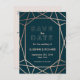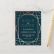 A modern and contemporary winter wedding "Save the Date" postcard, features a "faux foil" gold rose geometric pattern over a dark turquoise background. All your details are spelled in a beautiful modern typo.