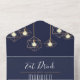 A bold modern wedding invitation with glowing geometric pendant lights and the phrase 'Eat, Drink, and be Married'. Background colour can be customised to match your event theme. Shown in an elegant navy blue.
