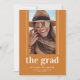 Simple 2025 graduation announcement card featuring a modern orange background that can be changed to match any school or favourite colour. The main focus is on the graduate themselves – their photo takes centre stage, with two sleek lines running down either side to add a touch of modernity. The result? A statement that screams "this is the grad!". And of course, their name, school/college, and class year are elegantly displayed, making sure everyone knows who the star of the show is. The bold, geometric pattern on the back adds a touch of sophistication, without taking away from the front.
