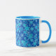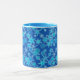 Mug in a modern geometric snowflake pattern - shades of turquoise, ice blue and white, on a rich sapphire / cobalt blue background