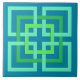 Ceramic tile in a retro modern pattern of interlocking squares, in light aqua, jade green, and light lime green, on a turquoise / teal blue background