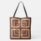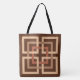 Printed tote bag in a retro modern pattern of interlocking squares, in tan, light mocha, and rust brown, on a dark chocolate brown background