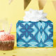 Wrapping paper in a four-way, Mid-Century Modern, geometric tile pattern in shades of light to deep denim blue