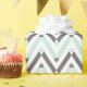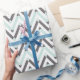 Modern wrapping paper with geometric mint blue, white, grey chevron pattern.
